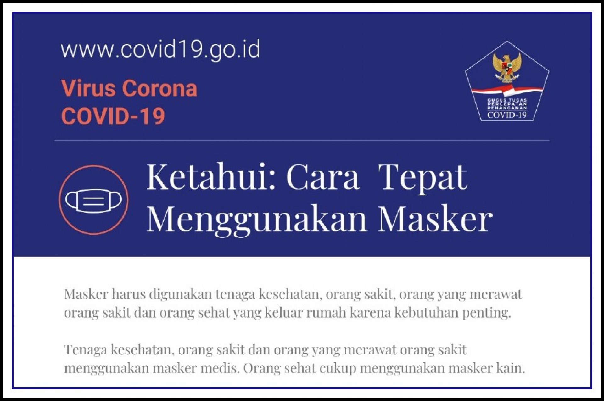 Jangan buka tutup masker. Jangan menyentuh masker. Bila tersentuh, cuci tangan pakai sabun dan air mengalir minimal 20 detik atau bila tidak ada, gunakan cairan pembersih tangan (minimal alkohol 60%)