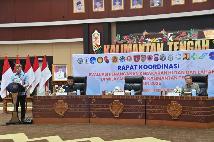 Plt. Sekretaris Daerah (Sekda) Leonard S. Ampung, mewakili Gubernur Agustiar Sabran, memimpin Rapat Koordinasi (Rakor) Evaluasi Penanganan Kebakaran Hutan dan Lahan (Karhutla) di Wilayah Provinsi Kalimantan Tengah Kalteng, di Aula Jayang Tingang, Kompleks Kantor Gubernur, Kota Palangka Raya, Kamis, 16 Oktober 2025.