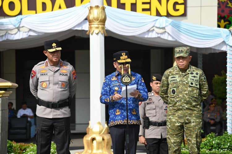 Apel Kesiapan Penanggulangan Karhutla tersebut digelar di Lapangan Barigas Mapolda Kalteng, Kota Palangka Raya, Jumat, 17 April 2026. Tampak mendampingi Gubernur, Kapolda Irjen Pol Iwan Kurniawan dan Pangdam XXII/Tambun Bungai Mayjen TNI Zainul Arifin.