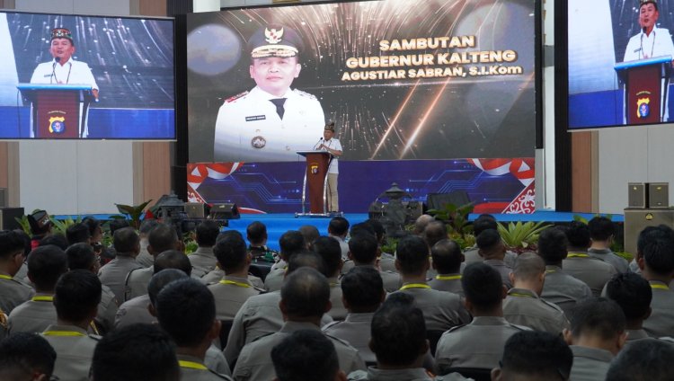 Gubernur Agustiar Sabran hadir memberikan materi dan motivasi kepada jajaran kepolisian peserra Apel Kepala Satuan Wilayah (Kasatwil) jajaran Polda Se-Kalimantan Tengah (Kalteng), bertempat di Gedung Kerucut Mapolda, Kota Palangka Raya, Sabtu, 6 Desember 2025.