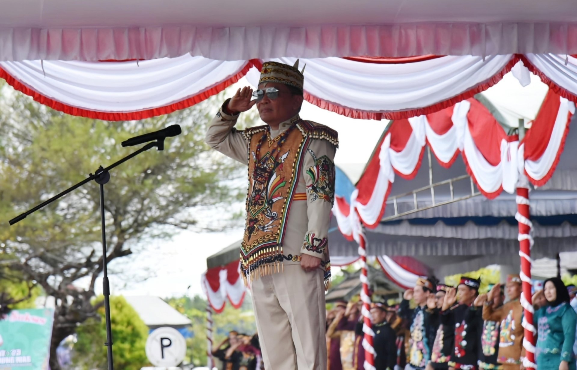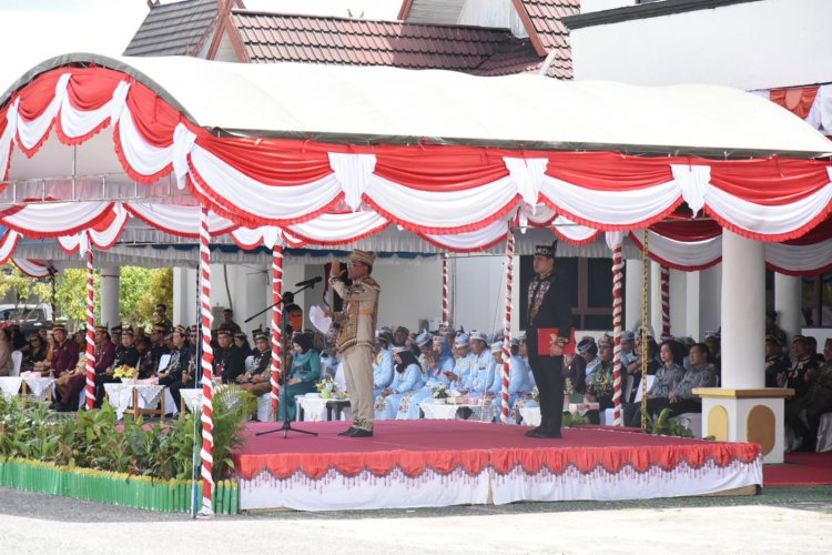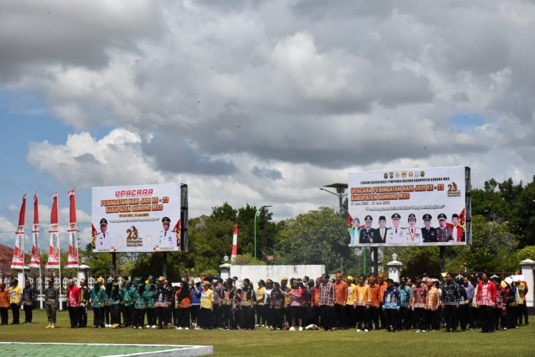 Gubernur Kalimantan Tengah (Kalteng) Agustiar Sabran bertindak selaku Inspektur Upacara (Irup) Peringatan Hari Jadi ke-23 Kabupaten Gunung Mas, di halaman Kantor Bupati Gunung Mas, Kuala Kurun, Sabtu, 21 Juni 2025.